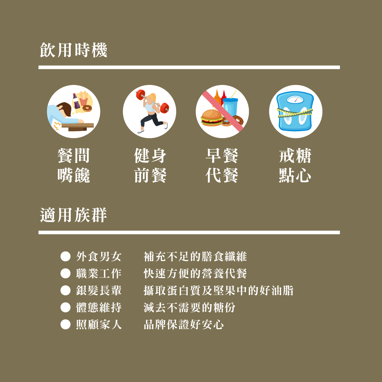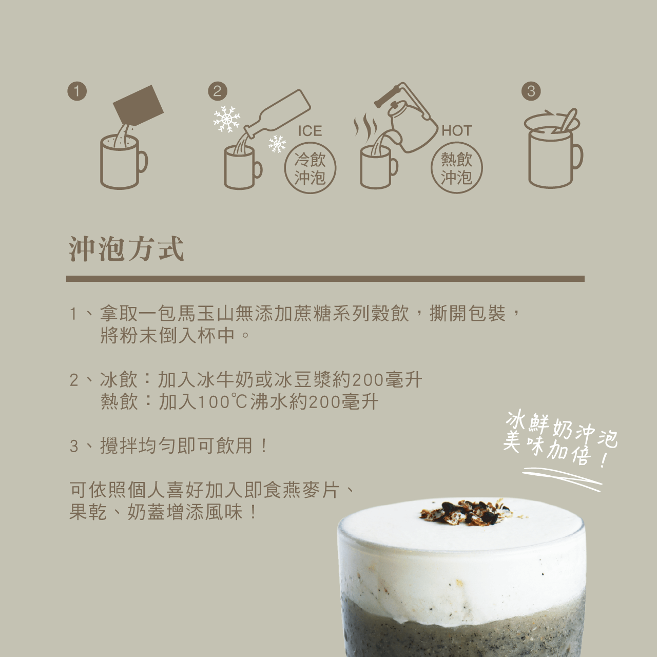 - 特別添加燕麥片、紅藜麥片、杏仁及核桃顆粒,使用冰鮮奶沖泡,美味加倍!