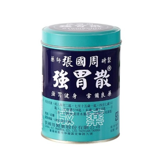 「張國周胃散」乃創始人張國周藥師所調配,以西藥調配中藥達成藥效相輔的療效,是一種有效中和胃酸的散劑,味道清香獨特。