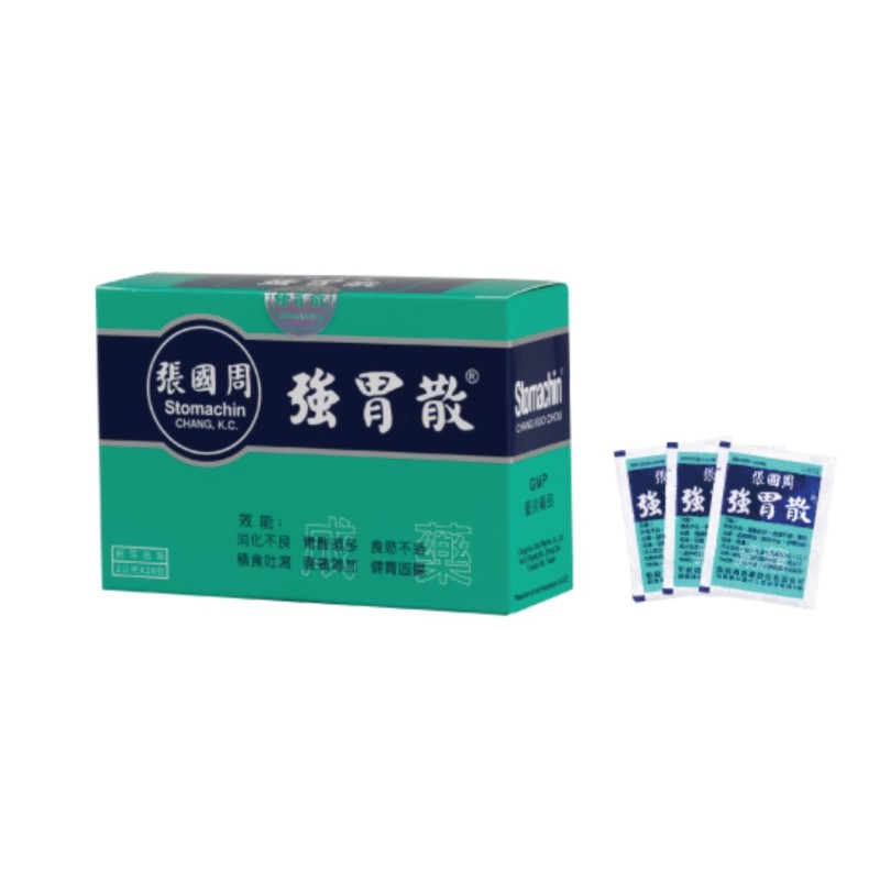 「張國周胃散」乃創始人張國周藥師所調配,以西藥調配中藥達成藥效相輔的療效,是一種有效中和胃酸的散劑,味道清香獨特。