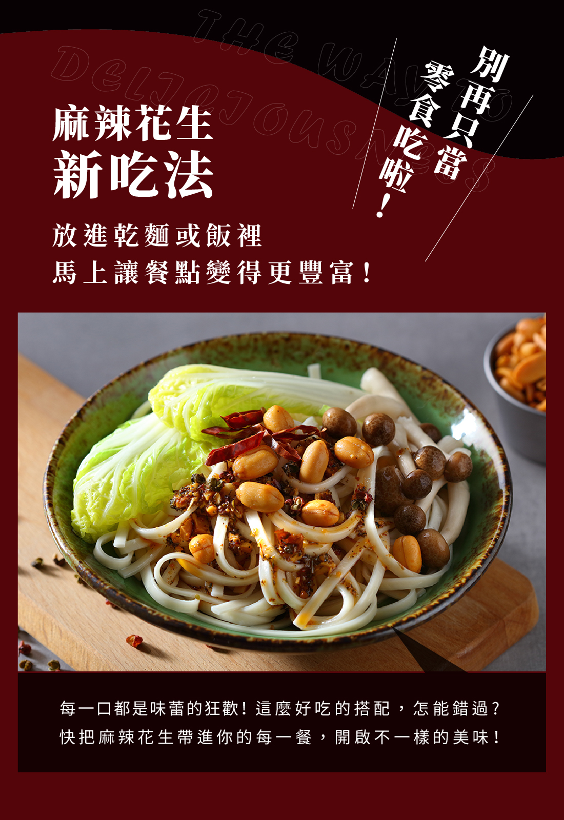 嚴選花生慢火拌炒,麻辣香氣層層堆疊,入口先香、後麻、再微辣,越吃越涮嘴。