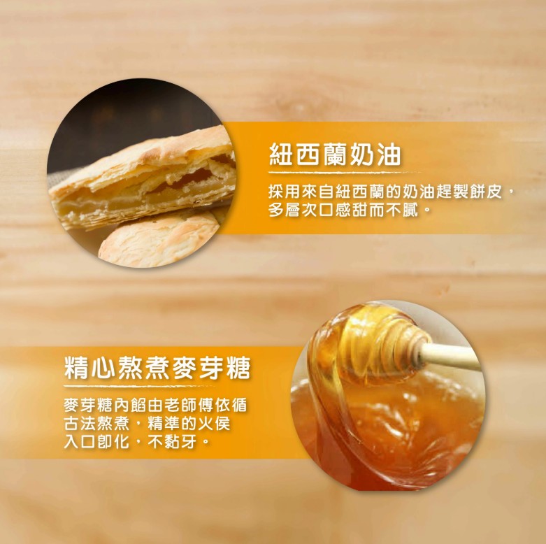 紅櫻花使用紐西蘭進口奶油與上選麥芽糖,耗工費時、精心熬煮而成奶油內餡,搭配手工細細桿製出層層酥鬆的餅皮, 透心甜軟的內餡,甜而不膩,